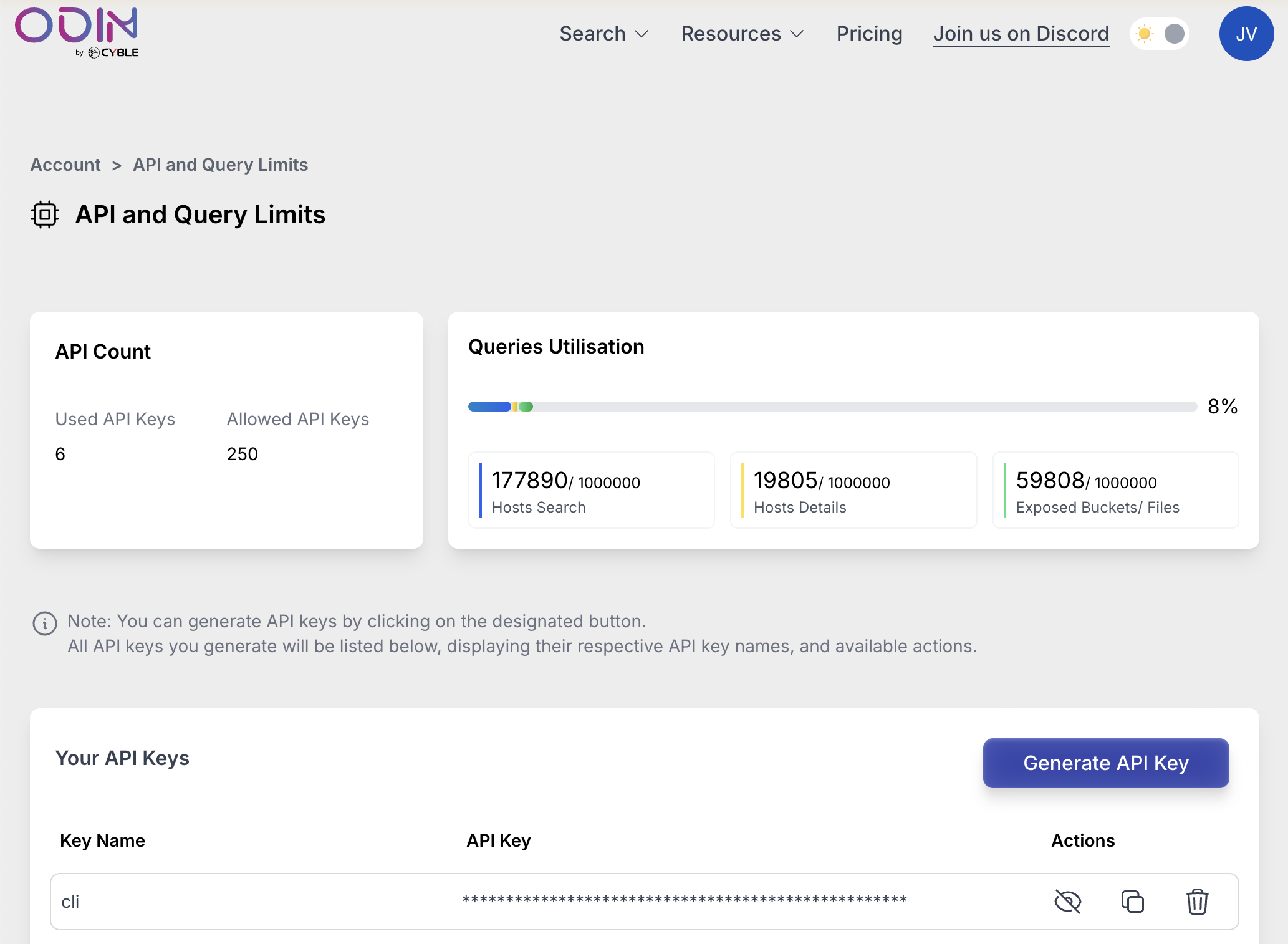 Once you’ve signed up and logged into Odin. You can generate or re-generate API keys by clicking on the designated button. All API keys you generate will be listed below, displaying their respective API key names, creation dates, and available actions. Through the toggle button in the ‘Action’ column, you can quickly turn an API key Enable or Disable or Delete the specific API key. To manage API keys, follow these steps:- Click on profile icon on top right and click on API and Query Limits to create a new API key.